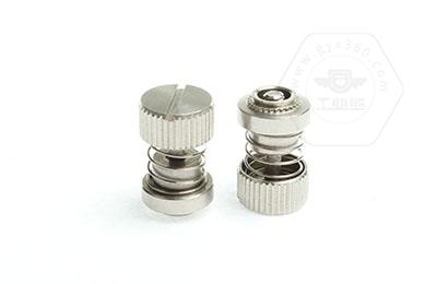 手緊螺釘?shù)膲恒T套具有壓花齒,壓裝于于機箱或薄鈑孔內(nèi)(注:薄板的鉆孔徑相對應彈簧螺釘?shù)膲糊X徑有一定要求的,形成一個外露的彈簧螺釘,用手擰另一端(即手擰端).因其里面固定有彈簧,螺釘相對于薄板的另一端來回進出。