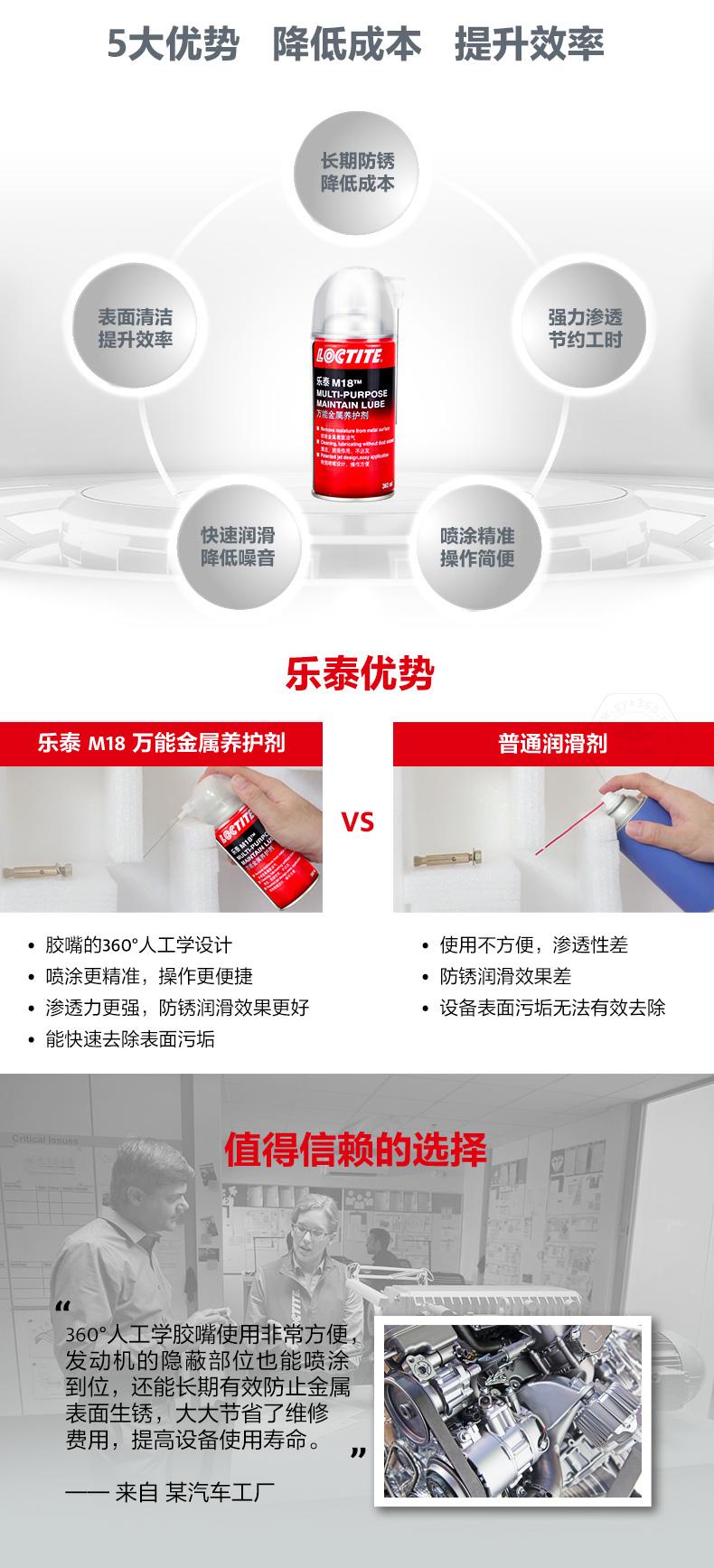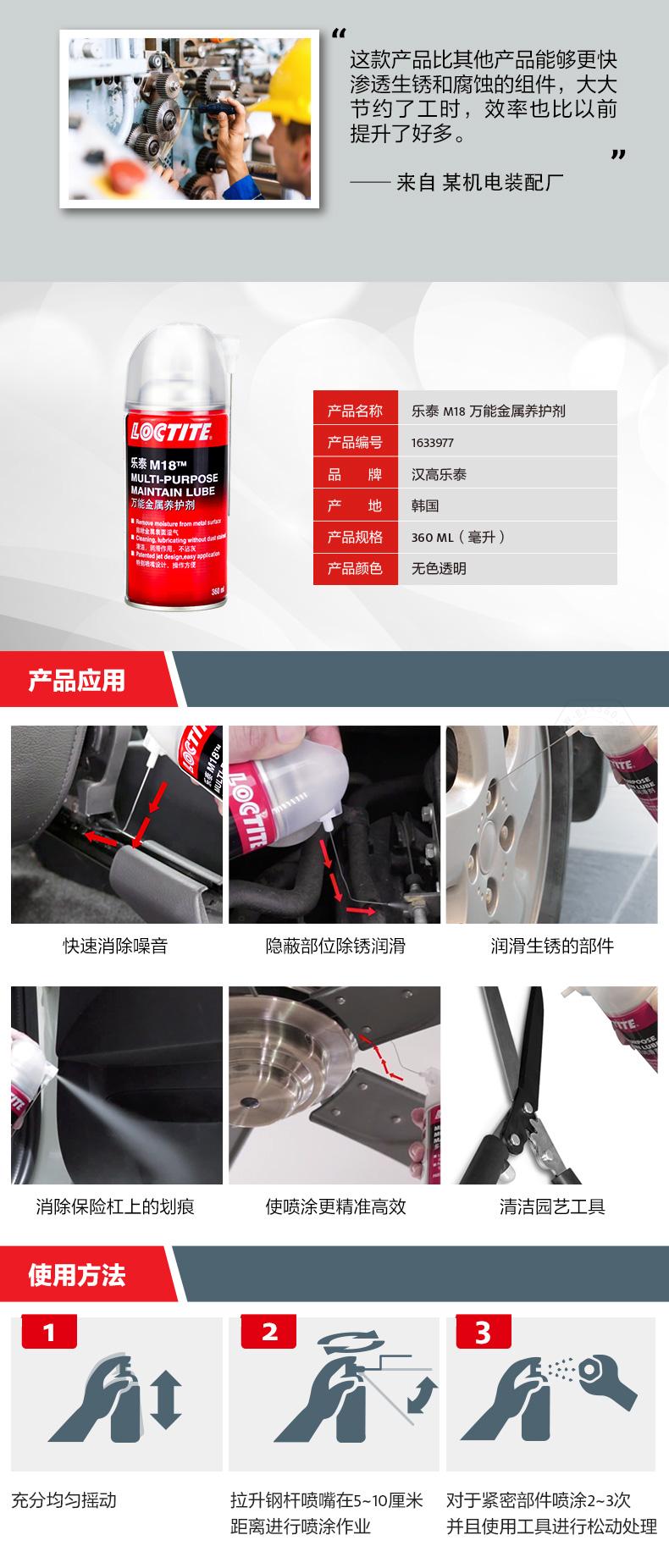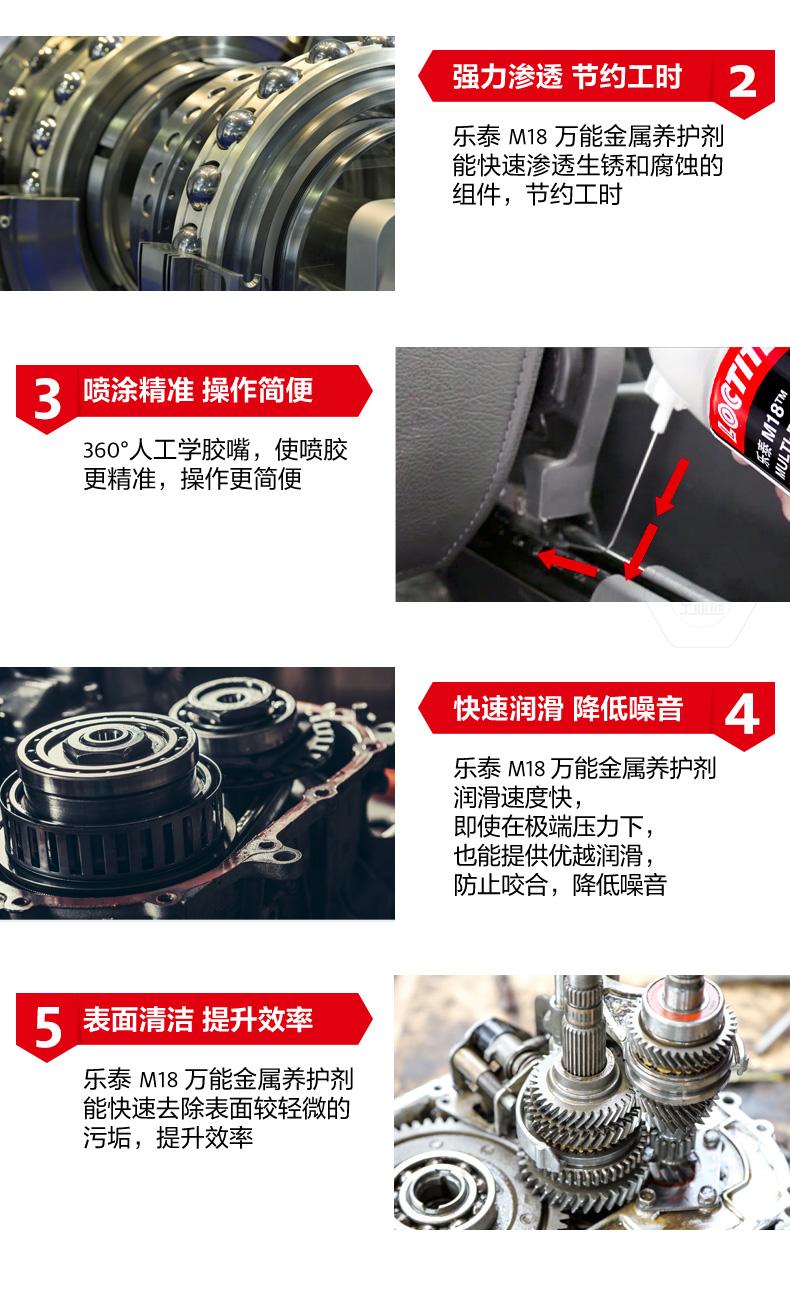 樂泰M18萬能金屬養(yǎng)護(hù)劑是一款集防銹、滲透、潤(rùn)滑、清潔于一體的產(chǎn)品。樂泰M18萬能金屬養(yǎng)護(hù)劑由于低表面張力,能夠在水分和金屬表面之間形成保護(hù)屏障,實(shí)現(xiàn)長(zhǎng)期防銹。樂泰M18萬能金屬養(yǎng)護(hù)劑可快速滲透生銹和腐蝕組件,節(jié)約工時(shí)。樂泰M18萬能金屬養(yǎng)護(hù)劑采用360°人工學(xué)膠嘴,噴涂更精準(zhǔn),操作更簡(jiǎn)便,還可快速潤(rùn)滑并降低噪音,同時(shí)去除表面較輕微污垢,提升效率。