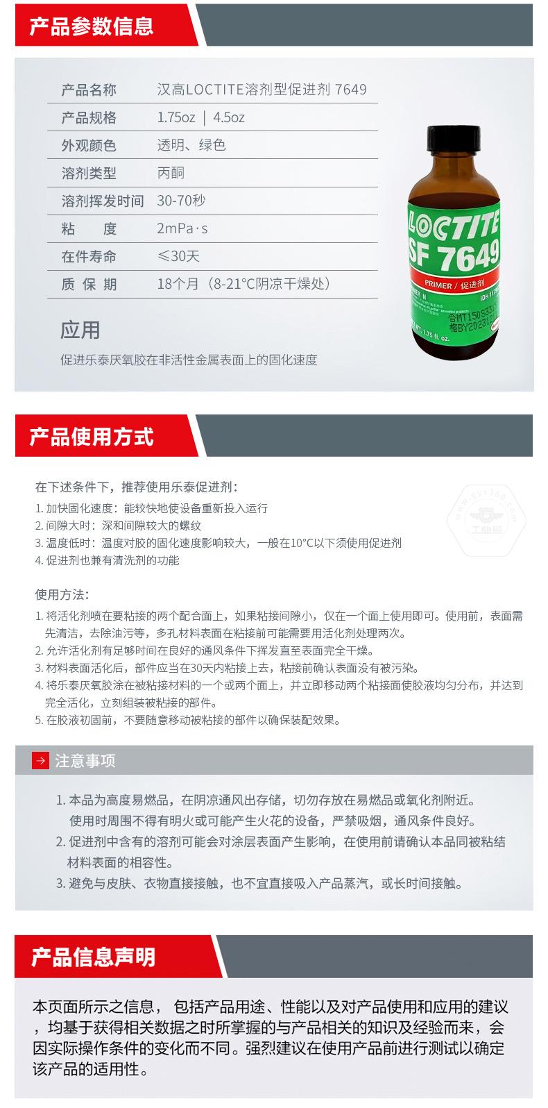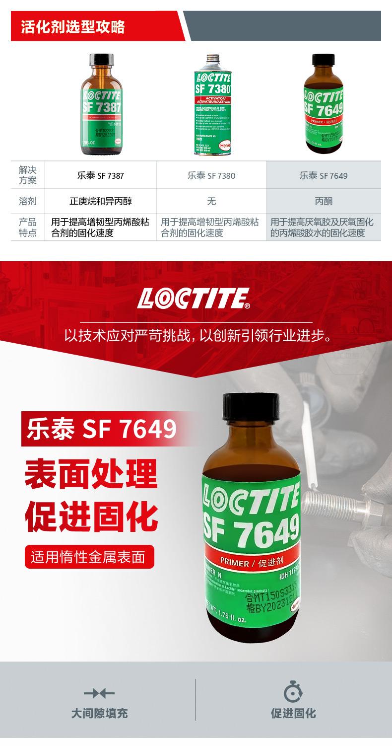 樂泰SF7649是一款用于表面處理、促進(jìn)固化的溶劑型促進(jìn)劑。樂泰SF7649適用于惰性金屬表面,可促進(jìn)樂泰厭氧膠在非活性金屬表面的固化速度,并兼顧大間隙填充需求。對于需要加快固化速度、間隙較大,或一般在10℃以下使用促進(jìn)劑的場景,樂泰SF7649更有針對性。樂泰SF7649規(guī)格為1.75oz和4.5oz,外觀為透明、綠色,溶劑類型為丙酮,溶劑揮發(fā)時間30-70秒,粘度2mPa·s,在件壽命≤30天,質(zhì)保期18個月(8-21℃陰涼干燥處)。