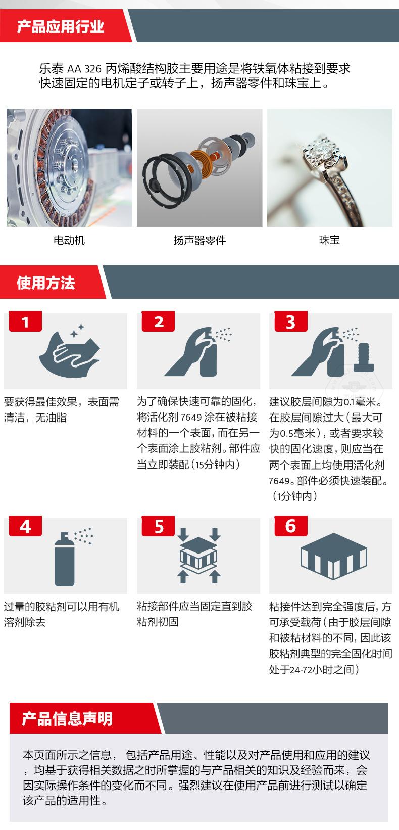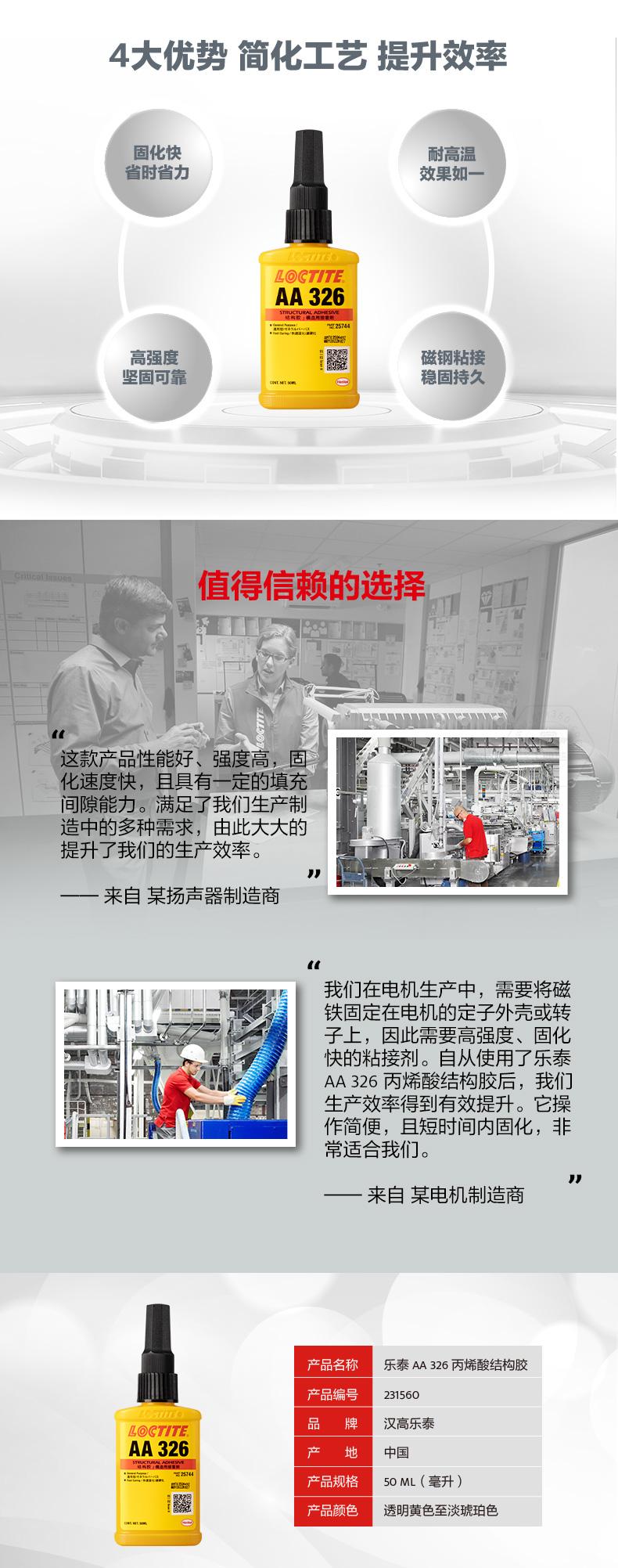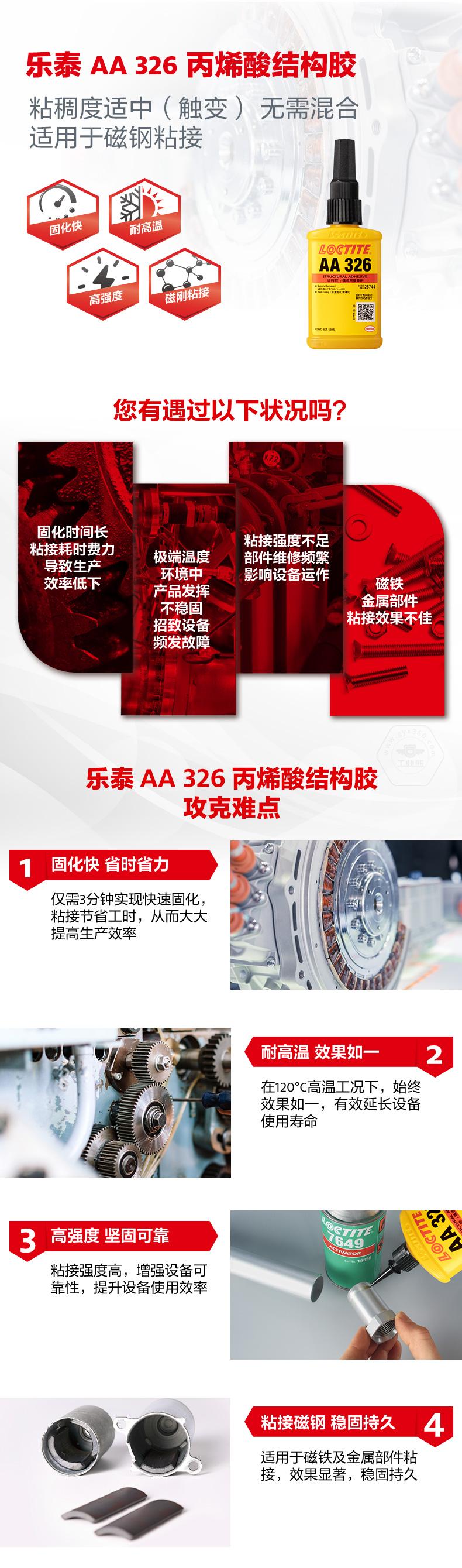樂泰AA326丙烯酸結構膠粘稠度適中(觸變),無需混合,適用于磁鋼及金屬部件粘接。樂泰AA326丙烯酸結構膠僅需3分鐘即可快速固化,節(jié)省工時。樂泰AA326丙烯酸結構膠在120℃高溫工況下效果如一,且具備高強度特點。樂泰AA326丙烯酸結構膠主要用于將鐵氧體粘接到要求快速固定的電機定子或轉子上,也可用于揚聲器零件和珠寶。
